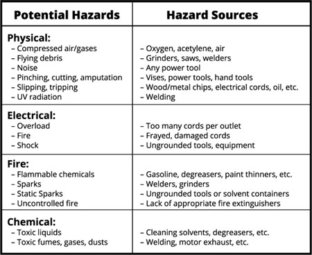 Always wear safety glasses with side shields when working with shop equipment. Additional protection using goggles or face shields may be necessary for the following types of work: